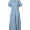 Liten kort puff arm og kapper på skjørte. Knapp i rygg for lukking.